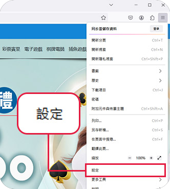 1. 打開火狐遊覽器,在最右上方選擇[三線]圖示, 然後選取[設定]。